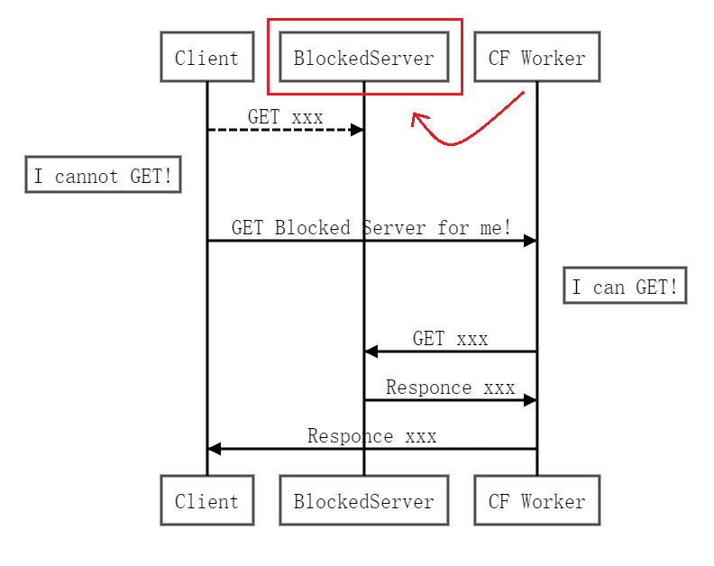 Client --> BlockedServer: GET xxx note left of Client: I cannot GET! Client -> CF Worker: GET Blocked Server for me! note right of CF Worker: I can GET! CF Worker -> BlockedServer: GET xxx BlockedServer -> CF Worker: Responce xxx CF Worker -> Client: Responce xxx