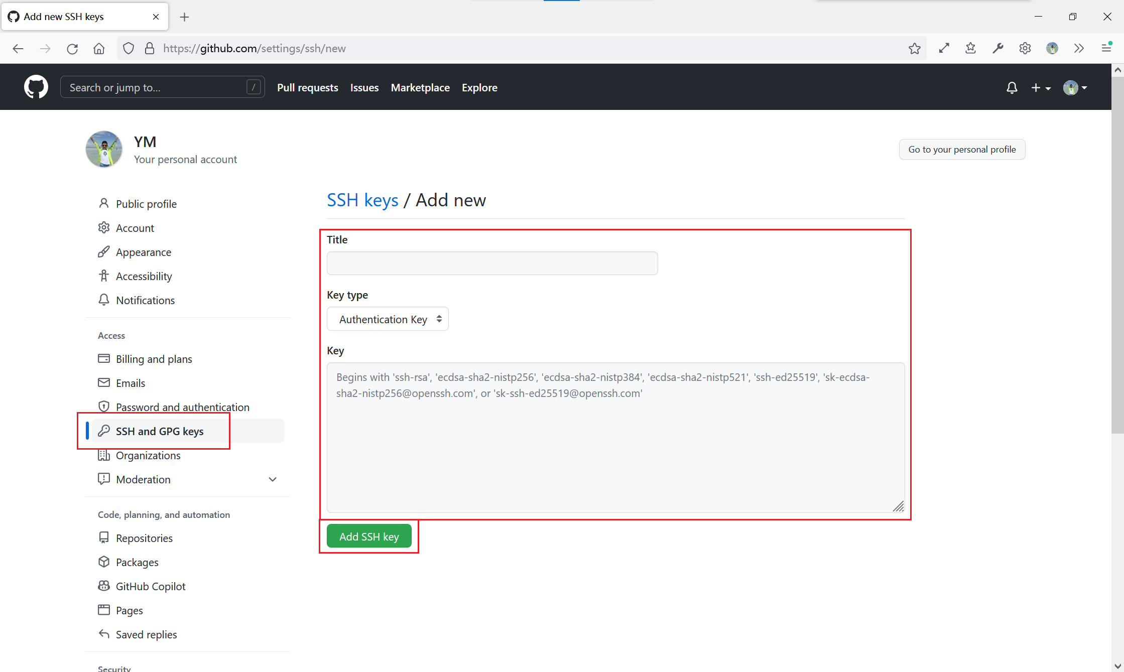在左边的栏目中选择SSH and GPG Keys:然后在出来的右边的框框中选择 New SSH:其中Title可以随意写个名字,Key里面的内容需要把刚刚复制的id_rsa.pub文件中的内容拷贝进去,最后点击Add SSH key即可。