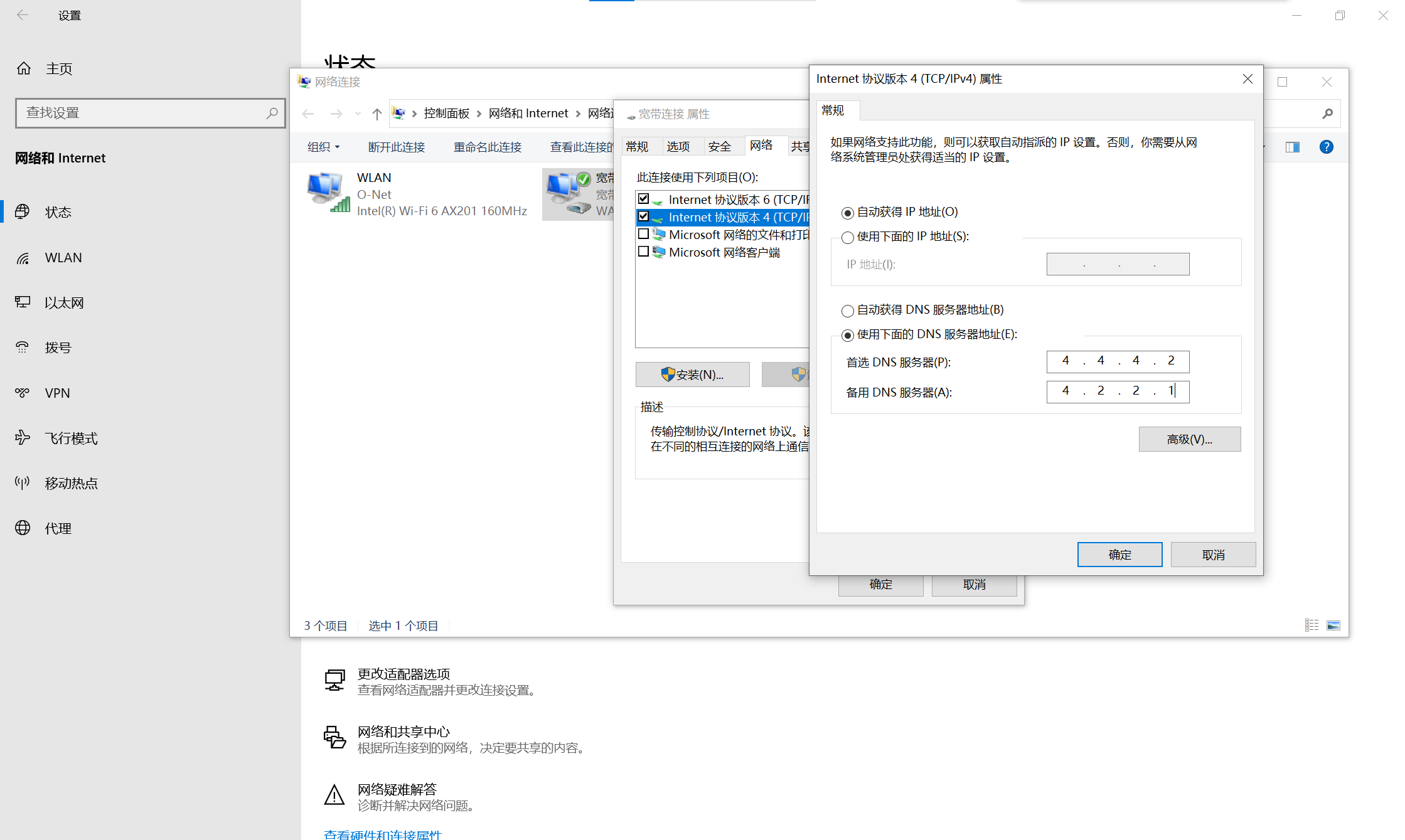 那怎么办呢?解铃还须系铃人。在不走代理的情况下,最优的解决办法是走微软的DNS解析,即4.4.4.2或4.2.2.1。具体调法,在IPv4的属性里面找一下: