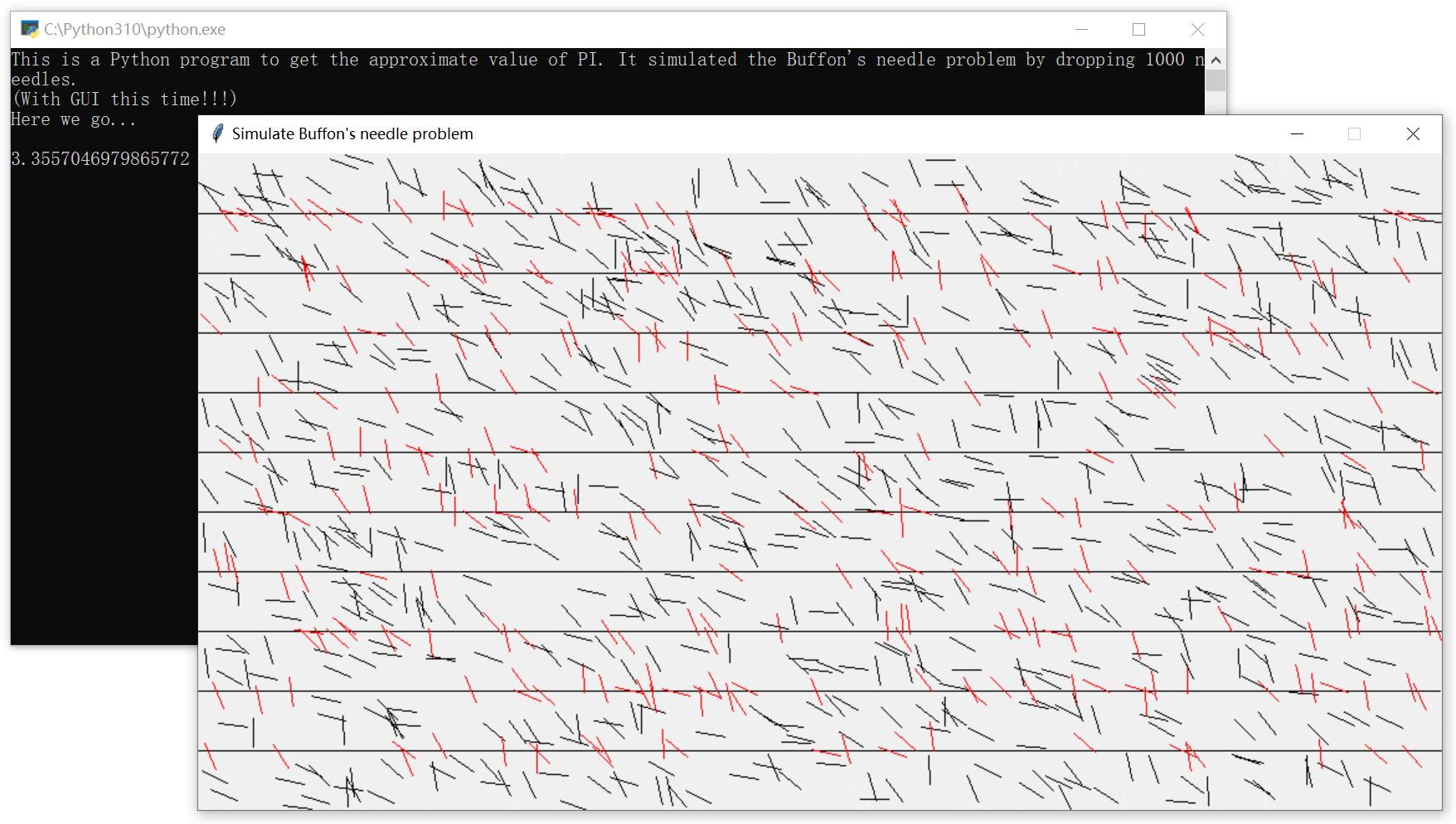 这个Pygame版本我个人觉得写的比较臃肿,由于为了避免掉绘制出界的针且因为Pygame和tkinter在主循环逻辑上的不同(tkinter可以边运行变更新画面,Pygame一定要全计算好再整体绘制),我先循环直到生成1000根合适的针,再绘制,但也没有找到更简单的方法。
