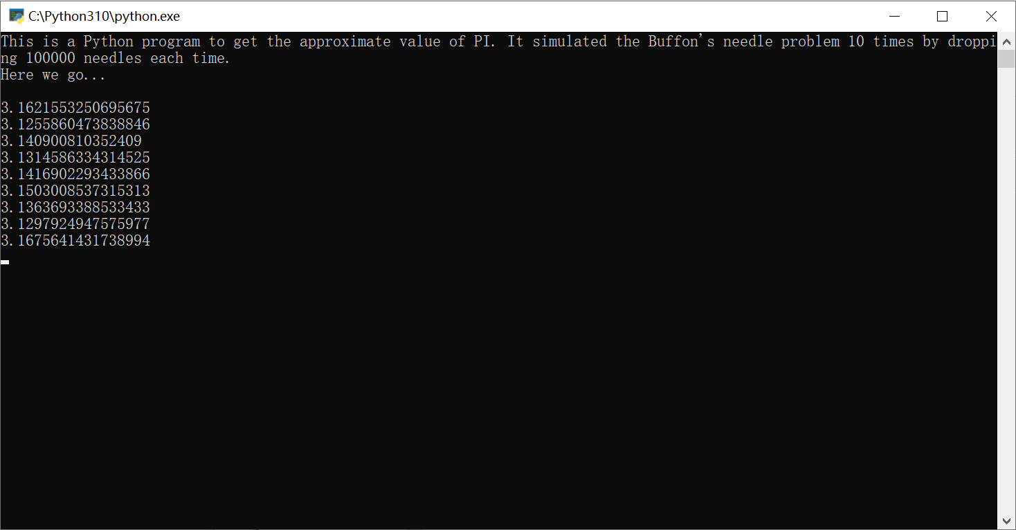 最后的话我们就循环10次,每次”投掷“100000根针并判断是否碰撞并计数。最后用次数100000除以碰撞次数即可。据测试,这种方法的精确度在十分位(即精确到3.1)。