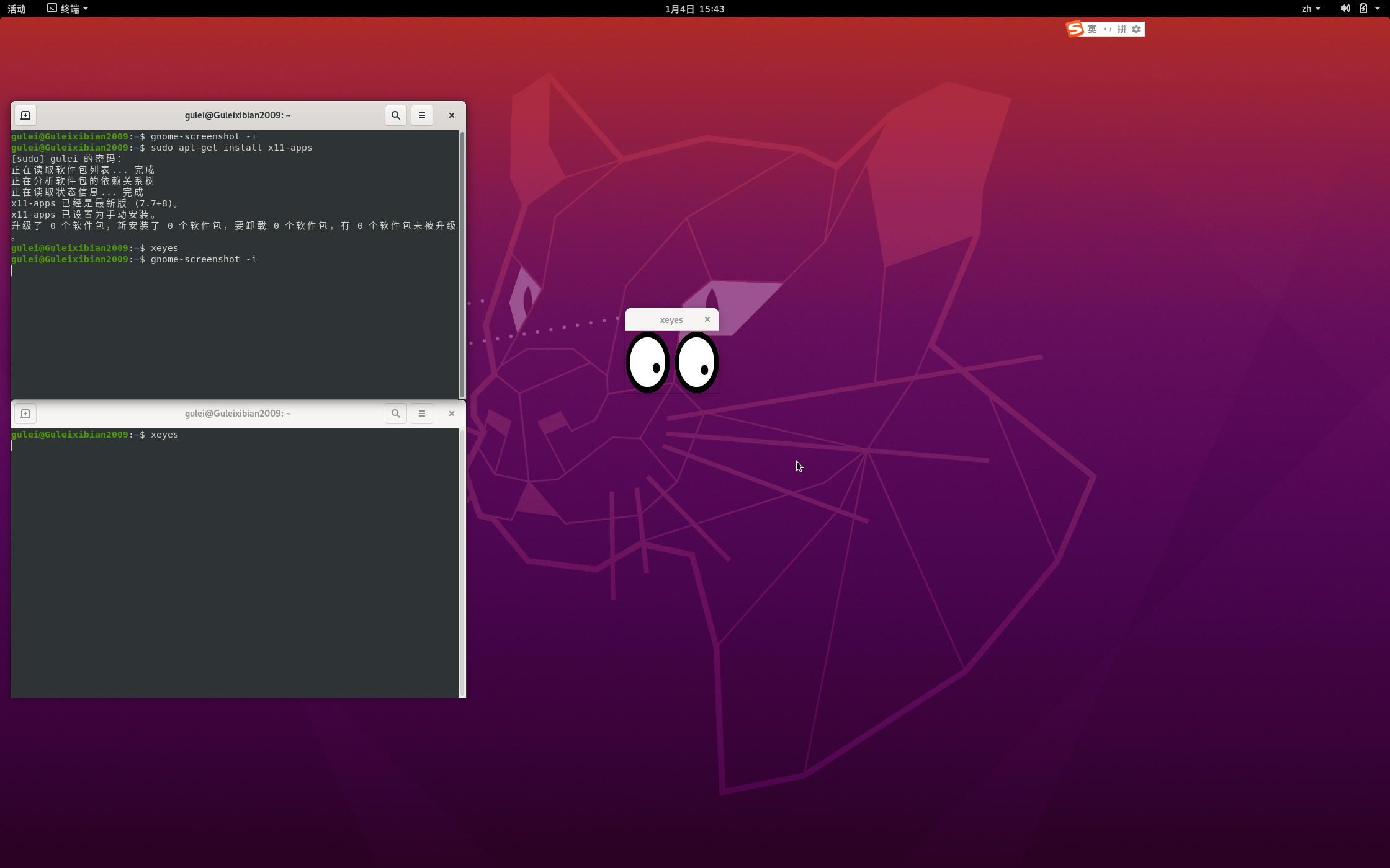安装之后就可以用xeyes来唤起一双盯着鼠标看的大眼睛了。